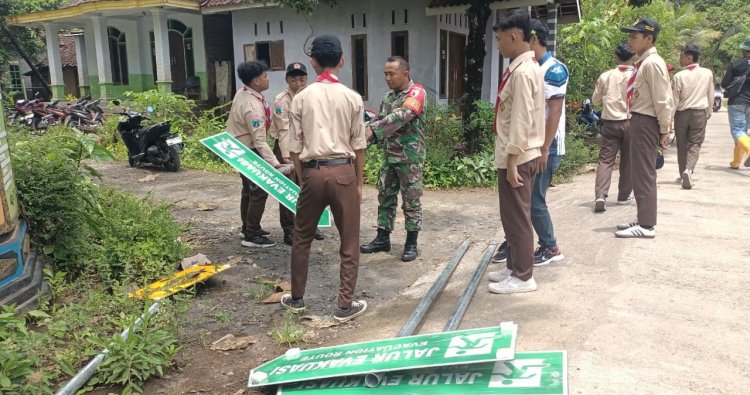 Anak-anak Pramuka dengan penuh antusias membantu pemasangan papan petunjuk, sementara warga turut memastikan posisinya tepat dan mudah terlihat.