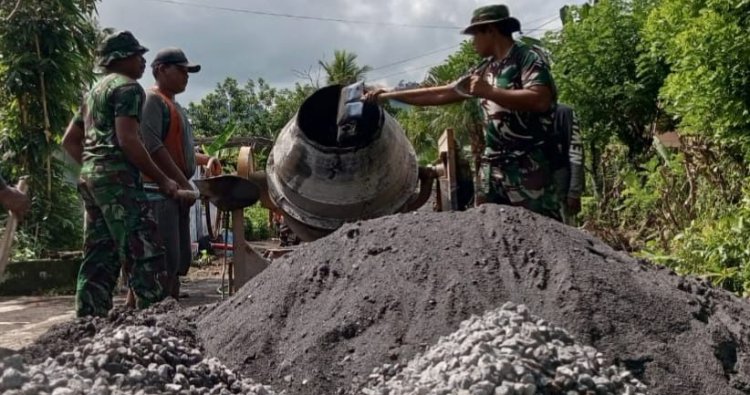 Suara mesin molen, serok pasir dan batu koral berpadu menjadi irama kebersamaan. Bagi prajurit TNI, setiap ayunan sekop dan cangkul bukan sekadar pekerjaan fisik, tetapi wujud pengabdian untuk membantu masyarakat desa agar terhindar dari genangan air dan memperlancar aliran irigasi sawah.