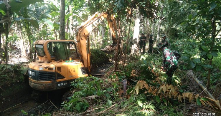 MALANG - Kegiatan TNI Manunggal Membangun Desa (TMMD) ke-126 Kodim 0818/Malang-Batu terus menunjukkan progres signifikan. Kali ini, prajurit TNI dari Kodim 0818 bersama personel Satuan Angkatan Laut dan masyarakat melanjutkan pekerjaan normalisasi saluran irigasi dengan menggunakan alat berat di Dusun Lebaksari Desa Lebakharjo Kecamatan Ampelgading Kabupaten Malang. Senin (27/10/2025).