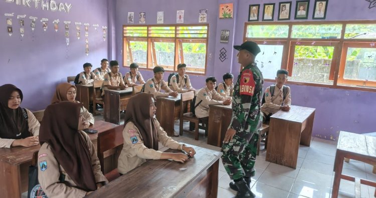 Salah satu anggota Satgas TMMD 126 Kabupaten Malang, Sertu Fariq, hadir di SMK 1 PGRI Ampelgading untuk memberikan pemahaman kepada ratusan pelajar tentang jati diri dan tugas seorang prajurit TNI.